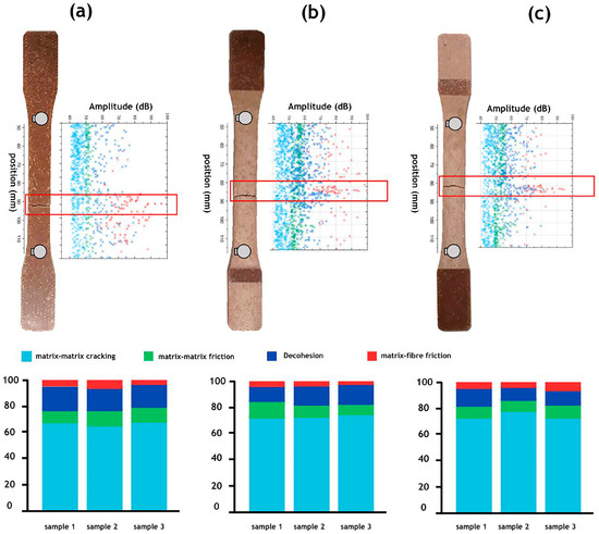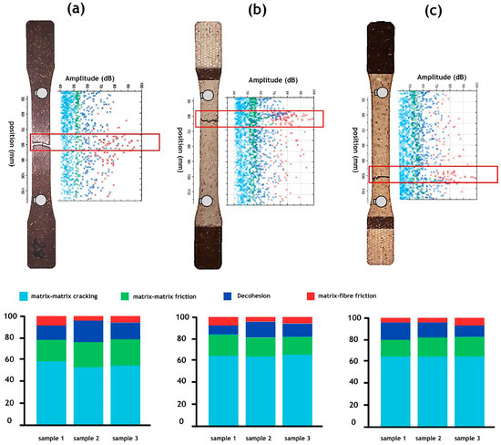 Amplitude versus location of acoustic events recorded during a tensile test on the PP–flax sample for (a) the non-aged condition, (b) Condition 1, and (c) Condition 2 compared with the sample picture after failure.