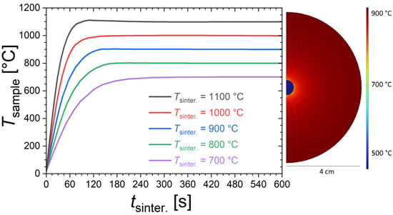 Time dependence of the sample temperature (Tsample) for different furnace temperatures, estimated from finite element simulations. On the right, illustration of the temperature distribution calculated from finite element simulations at tsinter. = 30 s for a furnace temperature of Tsinter. = 900 °C.
