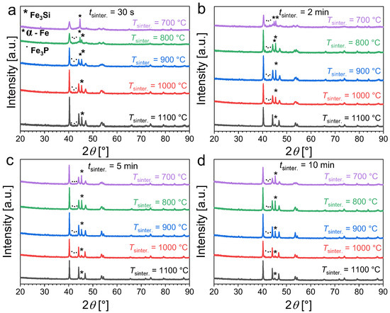 Powder X-ray diffraction patterns measured at room temperature for Fe1.85Co0.1P0.8Si0.2 powders sintered at different temperatures and for various sintering durations (30 s panel (a), 2 min panel (b), 5 min panel (c) and 10 min panel (d)).