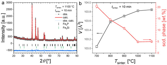 Panel (a), Illustration of a refined XRD pattern measured at room temperature for Fe1.85Co0.10P0.8Si0.2 sintered at 1100 °C for 10 min. Panel (b), Unit cell volume and secondary-phase content of Fe1.85Co0.10P0.8Si0.2 samples sintered during tsinter. = 10 min at different temperatures.