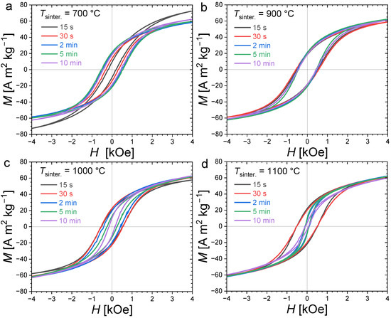 Room-temperature (T = 300 K) magnetization hysteresis curves for Fe1.85Co0.10P0.8Si0.2 bulk polycrystalline samples sintered at different temperatures (700 °C, 900 °C, 1000 °C and 1100 °C in panel (a), (b), (c) and (d), respectively) and durations (from 15 s to 10 min).