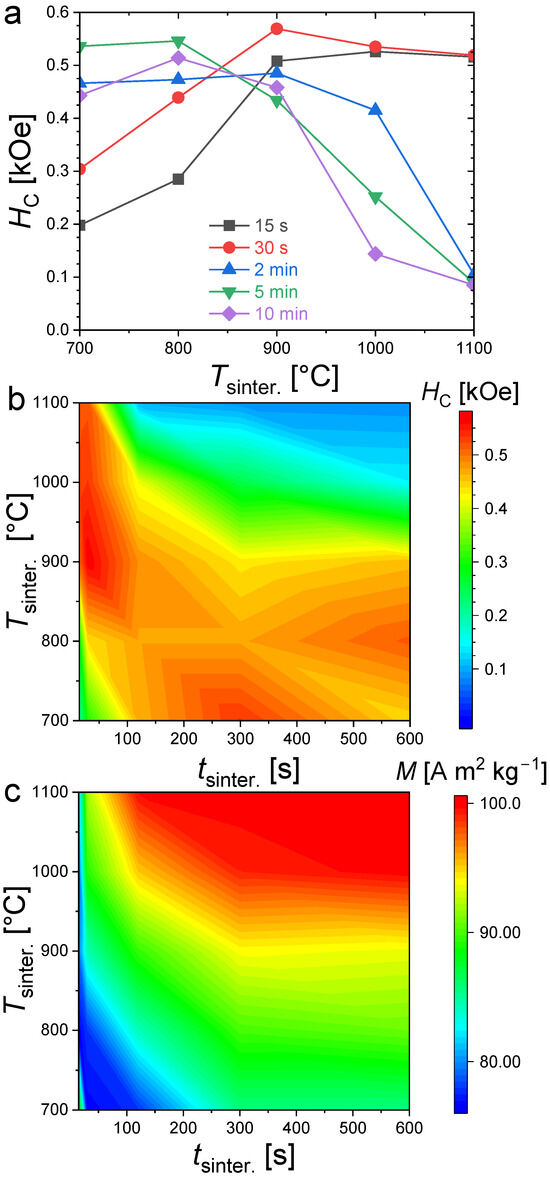 The coercivities show a very different distribution than the saturation magnetization as a function of the sintering conditions (see Figure 5). High coercivities tend to form a strip starting for the shortest sintering times at the highest temperatures and broadening toward longer sintering at lower temperatures. It is particularly interesting to point out that the largest coercivities are not observed in the purest samples synthesized at high temperatures (Tsinter. ≥ 1000 °C) for a long time (tsinter. ≥ 5min). The largest coercivities are rather observed in the (Fe,Co)1.95(P,Si) samples presenting significant amounts of secondary phases. For instance, all the samples synthesized at 900 °C (from 15 s to 10 min sintering) present a large contamination of cubic Fe3Si secondary phase (>10 wt.%) plus traces of Fe3P for a few samples. At a given sintering duration, the Fe2P-type phase content is less in samples sintered at 900 °C than that of the sample sintered at 1100 °C, and yet they show a larger coercivity.