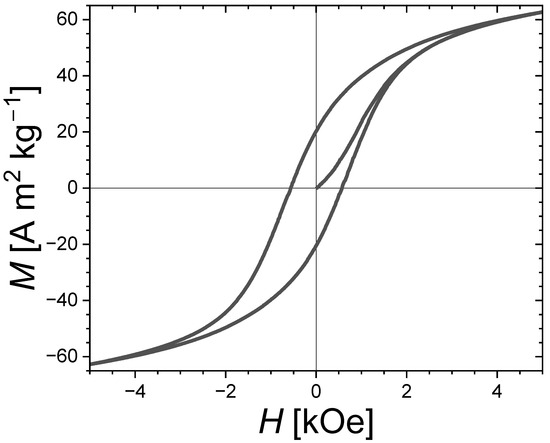 Magnetic hysteresis cycle with the first magnetization curve at T = 300 K for the Fe1.85Co0.10P0.8Si0.2 bulk sample sintered for tsinter. = 30 s at Tsinter. = 900 °C. A “non-magnetized” state was ensured by performing a demagnetization in evanescent-applied magnetic fields prior to the measurements.