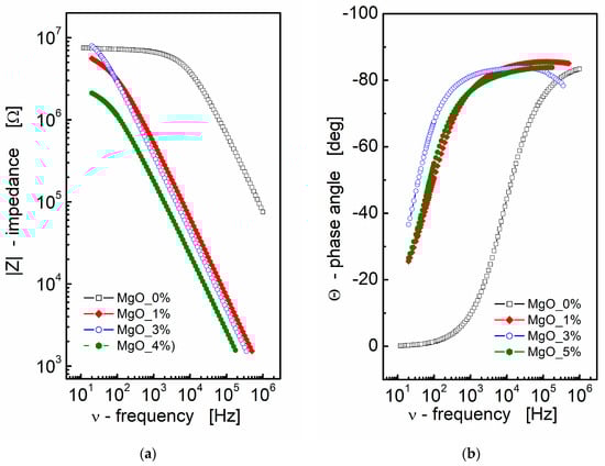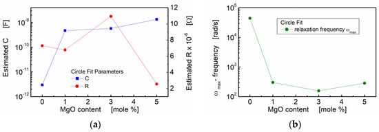 The Maxwell circuit permits separation of the electronic and ionic components of the total electrical conductivity. R1—resistance of the electronic components—and R2—resistance of the ionic components—increase with an increase in the MgO additive up to 3%, then decreases. CPE1 (geometrical capacitance of the sample): It increases with an increase in the MgO additive.