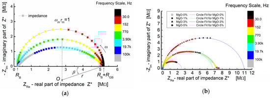 The Nyquist plots illustrating the impedance spectra of BST thin films, which have been modified with a MgO additive and annealed at