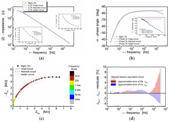 Figure 10c demonstrates that the impedance responses of the model circuits employed for fitting align well with the experimental data. The relative deviations of the real and imaginary parts of the complex impedance (residuals) computed under the assumption of the Maxwell electric equivalent circuit are depicted in
