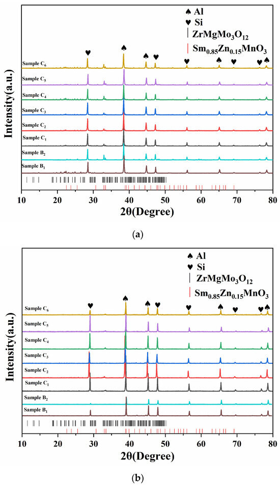 Six SZMO-ZMMO/Al-20Si composites (Samples C1 to C6), incorporating a combined NTE ceramic reinforcement content ranging from 6.5 to 13.5 vol%, were fabricated via a ball milling and vacuum heating-press sintering process. The additional amount of two kinds of NTE ceramic reinforcements is shown in Table 1. It should be noted that SZMO has a relatively high density of 8.6 g/cm3, and excessive incorporation into the composite would lead to increased composite density. Therefore, considering the requirement for lightweight composites, only 1.5–3.5 vol% SZMO was added in this study. Initially, the SZMO NTE ceramic powders, ZMMO NTE ceramic powders, and commercial Al-20Si alloy powders were weighed according to the stoichiometric ratio of the composite and placed in a zirconia ball milling tank along with zirconia balls at a ratio of 10:1 to obtain the powder mixture of commercial Al-20Si alloy, SZMO, and ZMMO NTE ceramics. Subsequently, the powder mixture was ball milled for 8 h using a QM-WX 4 planetary ball mill at a speed of 300 rpm in an anhydrous ethanol medium. Afterwards, the milled powder mixture of SZMO-ZMMO/Al-20Si powder was dried for 18 h at 55 °C in a DZF-6050 vacuum drying oven. Finally, the dried powder mixture of SZMO-ZMMO/Al-20Si was heated to 555 °C at a heating rate of 5 °C/min under a vacuum atmosphere at 60 MPa pressure for sintering purposes using the vacuum heating-press sintering method. The sintering process lasted for 3 h and the sintered composite bulks were subsequently cooled to room temperature within the furnace. The sintering temperature of 555 °C was determined based on the previous research conducted by our group and has been identified as the optimal temperature for achieving maximum densification of the composite. For comparison purposes, three reference samples were also prepared by ball milling and a heating-press sintering process similar to that employed for SZMO-ZMMO/Al-20Si composites. These reference samples include bulk Al-20Si alloy (Sample A), ZMMO/Al-20Si composites (Sample B1), and SZMO/Al-20Si composites (Sample B2).