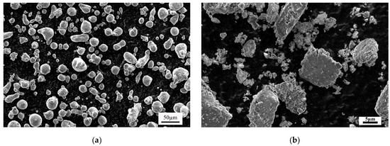 Figure 2 represents the typical morphologies of mixed powders. As shown in Figure 2, the morphology of Al-20Si powders underwent a transformation from nearly spherical particles (Figure 2a) to lamellar and flat particles (Figure 2b). Additionally, a significant number of fine SZMO and ZMMO NTE ceramic reinforcement particles were embedded on the surface of Al-20Si alloy particles (Figure 2b), due to the serious plastic deformation and work hardening of Al-20Si particles experienced during the ball milling process. This observation suggested that the toughed Al-20Si particles effectively capture brittle ZMMO and SZMO NTE ceramic particles in the process of ball milling, resulting in their dispersion within the Al-20Si alloy matrix.