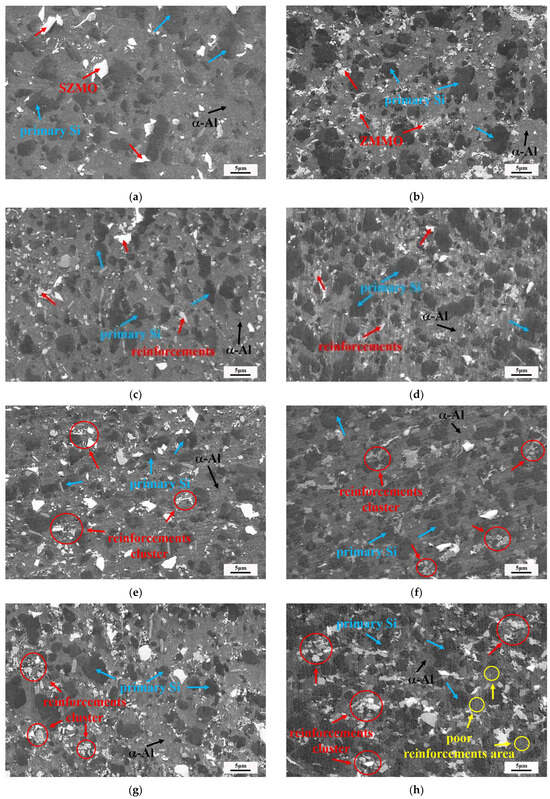 Microstructures of SZMO-ZMMO/Al-20Si composites: (a) B1; (b) B2; (c) C1; (d) C2; (e) C3; (f) C4; (g) C5; (h) C6.