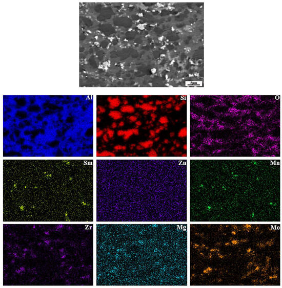 The microstructure of bulk SZMO-ZMMO/Al-20Si composites with varying ZMMO and SZMO reinforcement contents was observed using SEM, and the observation results are represented in Figure 3. It can be seen that all composites are composed of a gray matrix along with bright white and black second phases. In order to identify the phases in the microstructure more clearly, a representative sample of C4 was selected for analysis with SEM-EDS elemental mapping, and the results are represented in Figure 4. By combining XRD and EDS analyses in Figure 1 and Figure 4, it can be determined that the composites were composed of black primary Si, dark gray α-Al, and bright white SZMO and ZMMO NTE ceramic reinforcement phases. It is worth noting that although SZMO and ZMMO reinforcements could be distinguished from the SEM-EDS elemental mapping as shown in Figure 4, they were difficult to differentiate within the microstructure in Figure 3 due to their similar color appearance. Therefore, they are grouped in the subsequent analysis of their distribution.