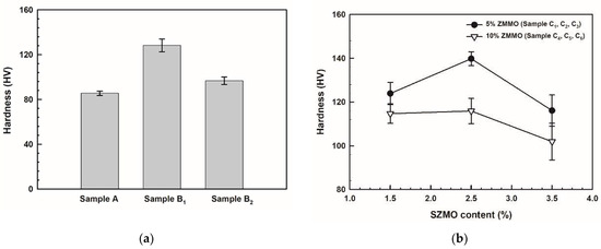 The hardness of (a) Reference samples (Sample A, Samples B1, and B2) and (b) Experimental samples (C1 to C6, SZMO-ZMMO/Al-20Si composites with varying reinforcement contents).