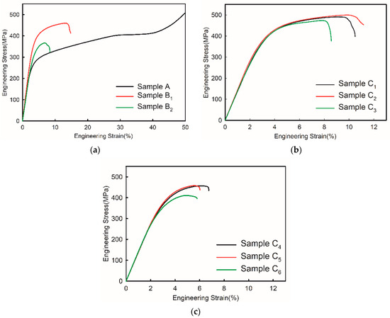Compressive stress–strain curves of (a) Reference samples (Sample A, Samples B1 and B2), (b) Experimental samples with 5 vol% ZMMO (Samples C1, C2, C3) and (c) Experimental samples with 10 vol% ZMMO (Samples C4, C5, C6).
