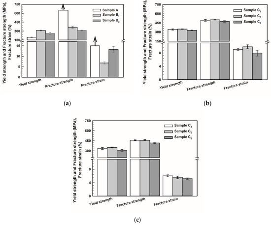 Compressive yield strength, compressive fracture strength and compressive fracture strain of (a) Reference samples (Sample A, Samples B1 and B2) (The arrow in the figure indicates that the sample didn’t fail and the estimated data was beyond the range of the Y-axis). (b) Experimental samples with 5 vol% ZMMO (Samples C1, C2, C3) and (c) Experimental samples with 10 vol% ZMMO (Samples C4, C5, C6).
