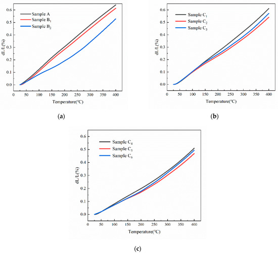 The relative length change curves of (a) Reference samples (Sample A, Samples B1 and B2), (b) Experimental samples with 5 vol% ZMMO (Samples C1, C2, C3) and (c) Experimental samples with 10 vol% ZMMO (Samples C4, C5, C6) in the range of room temperature to 400 °C.