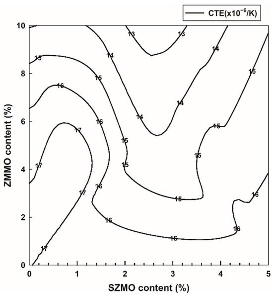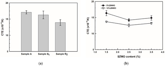 The CTEs of reference samples and experimental samples with dimensions of 4 mm × 4 mm × 8 mm were measured using a LINSEIS DIL L76 thermal dilatometer (LINSEIS, Selb, Bavaria, Germany) at a heating rate of 5 °C/min over a temperature range from room temperature to 400 °C. The CTE of measured composites was estimated according to Equation (1) [42], which defined it as the slope of the relative length curve of the measured composites with increasing temperature: