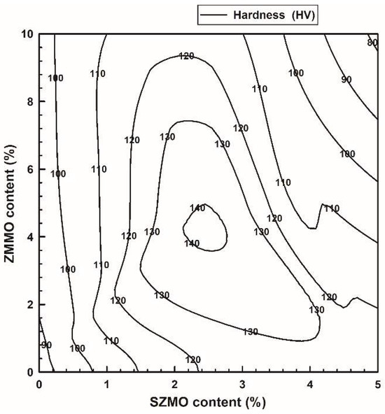 The synergy effect of SZMO and ZMMO NTE ceramic reinforcement content on the hardness of SZMO-ZMMO/Al-20Si composites.