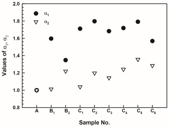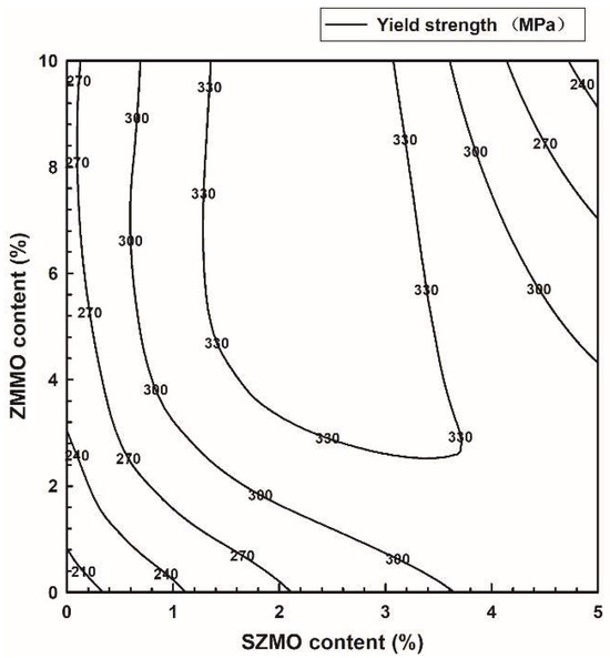 The combined analysis of Figure 10, Figure 11 and Figure 12 revealed distinct effects on the mechanical properties and CTE of SZMO-ZMMO/Al-20Si composites with a small amount of SZMO NTE ceramic reinforcements. Considering that the dimensional stability of SZMO-ZMMO/Al-20Si composites relies on not only their high yield strength but also on their low CTE, it is crucial to achieve a reasonable balance between strength and CTE in order to maintain the dimensional stability of these composites. Therefore, finding the ideal quantity for both SZMO and ZMMO NTE ceramic reinforcements necessitates considering how they affect mechanical properties as well as CTE. To address this, two parameters were proposed as expressed in Equations (3) and (4): α1 as an enhancement parameter of compressive yield strength and α2 as a reduction parameter of CTE.