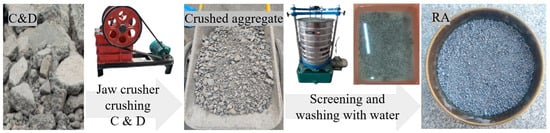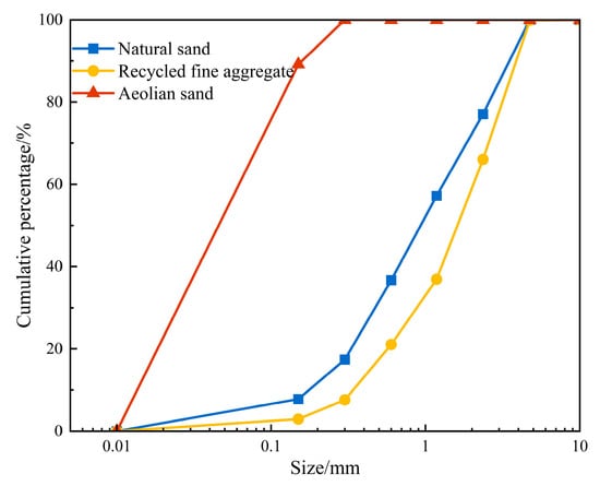 The experiment used P•O 42.5R ordinary Portland cement from Xinjiang Tianshan Cement Company (Urumqi, China). Class F fly ash (grade II) from China Construction Western Construction Xinjiang Co. (Urumqi, China)was employed. Natural sand, aeolian sand sourced from Kumutag in Xinjiang, and laboratory-created recycled fine aggregate (RA) were chosen as fine aggregates. The production process of RA is illustrated in Figure 1, with a water absorption rate of 9.4%. Additionally, the particle size gradation of the three fine aggregates can be seen in Figure 2. A polycarboxylic-acid-based high-performance water-reducing agent demonstrating a 25% water reduction rate and 36% solid content was used. A thickener and defoamer supplied by Qingjun Chemical (Jinzhou, China) were incorporated. For the production of ECC, polyethylene (PE) fiber of model 1600D developed by Telif Fiber Manufacturing Factory (Laiwu, China) was chosen, with specific performance indexes detailed in Table 1. Analytically pure anhydrous sodium sulfate from Zhiyuan Chemical Factory (Tianjin, China) and analytically pure sodium chloride from Sinopharm Chemical Reagent Co., Ltd. (Shanghai, China) were used. A modified mix proportion, determined through orthogonal testing on the original mixing ratio [34], indicated that 40% and 20% of recycled fine aggregate and wind-logged sand were replacements for natural sand. The volume mixing amount of PE fiber was set at 1.5% vol. Specific mix proportions can be seen in Table 2.