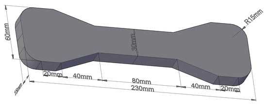 RAECC bone-type specimens (Figure 3) with dimensions of 230 mm × 60 mm × 15 mm were fabricated for uniaxial tensile testing, and RAECC prismatic specimens with dimensions of 400 mm × 100 mm × 100 mm were fabricated for resonance frequency determination.