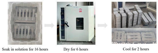 Referring to the specification GB/T 50082-2009 [35], the chemical erosion of specimens under dry–wet cycles was conducted on RAECC. A total of 40 dry–wet cycles were completed, with mechanical properties being tested once every 10 cycles. The dry–wet cycle erosion test procedure is illustrated in Figure 4. Specimens that had been through 28 days of regular upkeep were soaked in a solution for 16 h, then taken out and put in a lab oven adjusted to (80 ± 5 °C) for dehydration for 6 h, succeeded by 2 h of cooling, resulting in a dry–wet cycle every 24 h. The dry–wet cycle solutions included aqueous solution (W), 5% Na2SO4 solution (S), and 5% Na2SO4—3% NaCl solution (F).