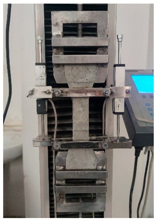 After the bone-type specimens were cured to the set age, the uniaxial tensile test of RAECC was carried out by a 5 kN LCD electronic tensile machine of model LDS-5 (Figure 5). The displacement control was adopted, and the loading speed was 0.5 mm/min. The changes in the length of the monitoring zone were recorded by installing two sets of Linear variable displacement transducers (LVDT) on both sides of the specimen, and the final value of the length change was taken as the average value of the two test results, with a measuring scale distance of 80 mm. Before the tensile test, pre-stretching was carried out, the tensile force data on the instrument of the tensile testing machine were observed, and when the data were displayed as 100 N, the recording of the test data was started to ensure that the specimen did not slide in the tensile process.