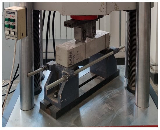After the prismatic specimens were cured to the set age, the four-point bending test of RAECC (Figure 6) was carried out by the microcomputer-controlled electro-hydraulic servo universal testing machine (WAW-600, range 600 kN) produced by Shanghai Hualong Testing Instrument Co. The prismatic specimens were placed on the lower two rollers at 50 mm from each edge of the specimen on both sides, and the loading method was stress-controlled with a loading speed of 0.06 MPa/s until the specimen was damaged by bending.