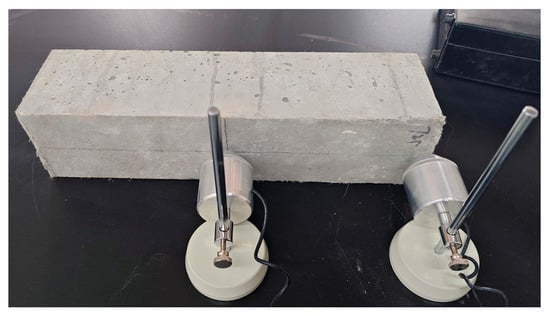 Referring to the specification GB/T 50082-2009 [35], as shown in Figure 7, the fixed side of the RAECC prismatic specimens was selected for the resonance frequency test, three specimens were tested in each group, and the test was carried out once every 5 dry–wet cycles. Since the initial resonance frequency of each group of specimens was not the same, to facilitate the comparison of the resonance frequency change between different groups of specimens, the change in resonance frequency ratio was used for the comparison, which is calculated as shown in Equation (1):