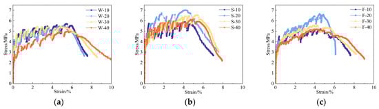 RAECC tensile stress–strain curve: (a) aqueous solution (represented by W), (b) 5% Na2SO4 solution (represented by S), and (c) 5% Na2SO4—3% NaCl solution (represented by F).