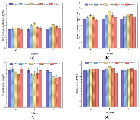 Mechanical properties of RAECC: (a) first cracking tensile strength, (b) ultimate tensile strength, (c) ultimate tensile strain, and (d) flexural strength. The codes W, S, and F in the figure denote an aqueous solution, a 5% Na2SO4 solution, and a 5% Na2SO4—3% NaCl solution, respectively.