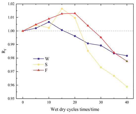 The filling effect of the erosion products inside the prismatic specimen caused the interior to become complete, increasing the value. However, with an increase in the number of cycles, the excessive erosion products started to damage the original internal pore structure, creating new matrix defects, which led to a decrease in completeness and, in turn, a decrease in the value. Based on the trend of the value, the order of erosion severity of the RAECC prismatic specimens by dry–wet cycling in different salt solutions was as follows: 5% Na2SO4 solution > 5% Na2SO4—3% NaCl solution > aqueous solution.