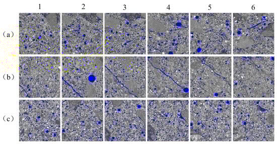 From the previous section, it is known that the 5% Na2SO4 salt solution eroded the specimens most severely; therefore, X-CT scans of the RAECC specimens after undergoing 0, 20, and 40 dry–wet cycles of erosion by 5% Na2SO4 salt solution were performed and analyzed (specimen numbers are denoted by C, S-20, and S-40, respectively.). The pore distribution of 2D slices of the X-CT scans of the specimens is shown in Figure 11, where blue color was chosen for rendering the pores, the characteristic slices in terms of increasing height are shown from left to right, and six images were selected from each group of specimens to be analyzed.
