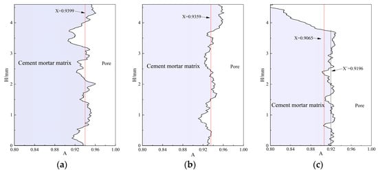 Since different depths under the surface of the specimen are subjected to different degrees of erosion during sulfate erosion, and the closer the matrix is to the surface, the more serious the degree of sulfate erosion, the ratio of the area of the cement mortar matrix to the area of the overall cross-section of the CT-scanned 2D section (denoted as A) was calculated to analyze the effect of erosion on the internal porosity, and the specific results are shown in Figure 12. The straight line perpendicular to the x-axis in the figure is the mean value of A on different slices (X), and the 0~4.6 mm of the vertical axis scale represents the distance of the CT-scanned 2D slices from the surface of the specimen (H). Due to the small size of the CT specimen, the S-40 specimen caused the specimen to have missing corners when grinding, so the A-value curve decreased sharply at the position farther away from the surface of the specimen, which was ignored in the later analysis. From the two-dimensional section in Figure 11, the specimen of group S-20 was sampled in a poor location, and there was a diagonally cut crack on the inside, which had some influence on the analysis.