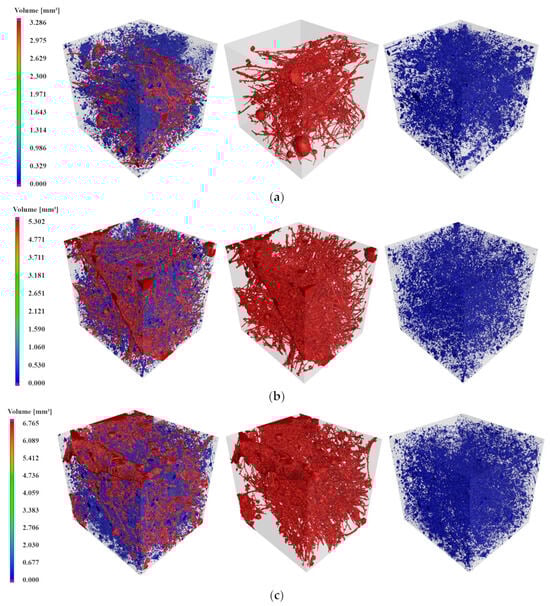 The pore structure of the 2D slices of the CT scan was analyzed after 3D reconstruction. The results, depicted in Figure 14, show red areas representing large, connected pores and blue areas indicating small pores. The analysis revealed that a significant portion of the total pores in the specimen were red connecting pores. This is attributed to the similarity in the grey scale between fibers and pores in the 2D slice images post-CT scanning, leading to the misidentification of PE fibers as pores during the 3D reconstruction. The PE fibers were well distributed in the specimen, often penetrating through most of the pores, resulting in a larger volume of maximum pores.