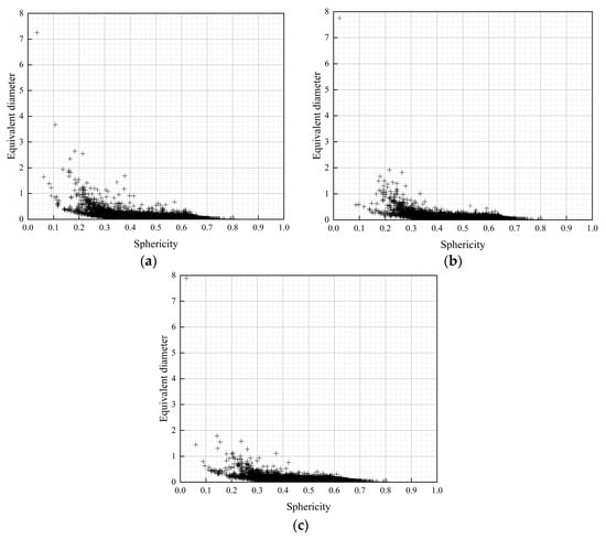 The sphericity can reflect the geometry of the pores: with a sphericity close to 1, the shape of the pores approximates to a sphere; with a sphericity close to 0, the shape of the pores approximates to a crack. The distribution of the pore sphericity and the equivalent diameter of the pores obtained in the X-CT reconstruction are shown in Figure 15. It can be seen that the diameter of the pores in the uneroded control specimen was larger, the sphericity was smaller, and the shape of the pores in the original state was more similar to a crack. After 20 dry–wet cycles with erosion by sulphate, due to the filling effect of the erosion products, the number of pores increased, the diameter decreased, the sphericity increased, and the stress concentration at the boundary of the pores with large sphericity rarely occurred [42]. Moreover, the shape and size of the pores were more homogeneous compared to the control, and the homogeneous pores caused an increase in the strength of the matrix. After 40 of dry–wet cycles with erosion by sulphate, due to the transitional filling of the matrix by the erosion products, matrix damage was caused, and the new pores produced at the time of damage were larger in size and number, and had poorer sphericity, which caused a high degree of stress concentration at the pore boundaries [43]. Moreover, the pores were affected by the filling of the erosion products, causing a reduction in strength.