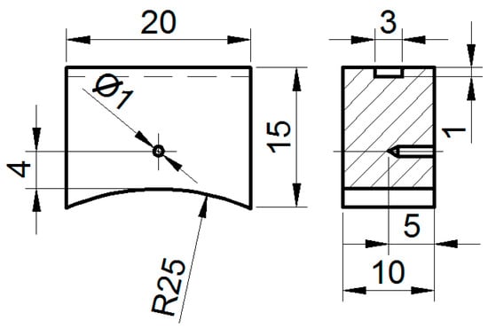 The counter body (50 mm diameter and 10 mm thick disk) was made from wheel steel. The working parts of the samples (R25, Figure 1) and, after fabrication, the counter bodies were polished in two steps with P1000- and P1500-graded sandpaper according to ISO-6344-2:2021 [25]. The samples were not subjected to special heat treatment.
