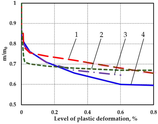 Note that an increase in the level of hardness heterogeneity, which is considered to represent a certain level of damage to the structure of the material’s surface layers, is not necessarily an indication of damage (i.e., the deterioration of specific operating characteristics). For example, in tensile tests of different materials, the largest changes in the homogeneity parameter occurred at a low elastic–plastic strain, with little effect on changes in the Young’s modulus E, the yield strength , or the strength . At the same time, in the zone of propagated plastic deformations, the hardness dispersion decreased, but the influence on the above mechanical characteristics increased. Figure 2 shows the relationships between the relative value of the homogeneity coefficient and the magnitude of the deformation of the materials with different grades. The graphs are based on the data provided in [39].