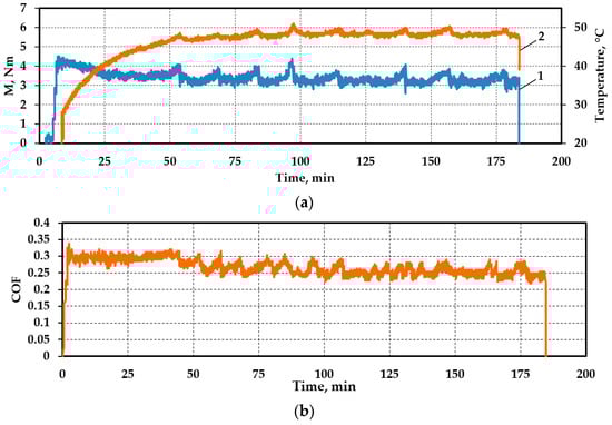 Variation in friction torque (1), temperature (2) (a), and coefficient of friction (b) for test regime “rail steel with lubricant No. 1”.