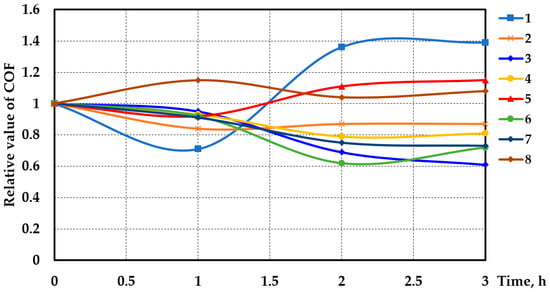 The initial value of the COF was determined after 5 min from the beginning of the experiments. For different samples, the initial values differed slightly from each other, which was due to the presence of still-undeformed additive particles and a possible difference in the roughness of the working parts of the samples. Therefore, to analyze the effect of various additives on the change in the coefficient of friction, the experimental data are given in relative values , where is the initial value of the coefficient of friction and is its current value.