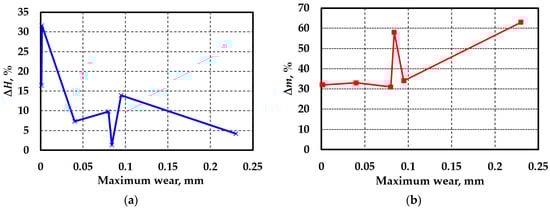 Dependence of the increase in the mean hardness (a) and the homogeneity coefficient (b) on the maximum wear.