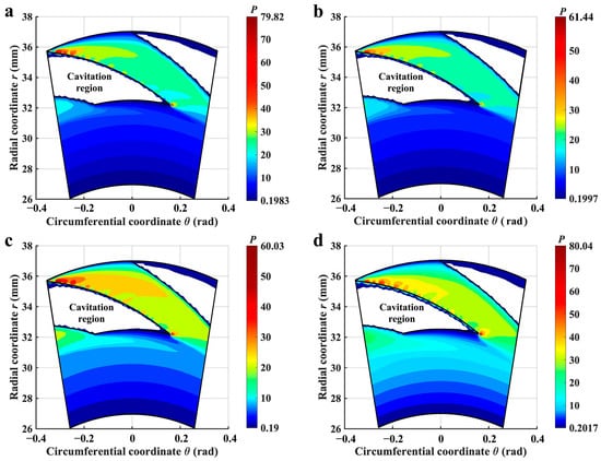 Due to the friction heat generated by the surface contact, a temperature gradient of order 1–10 K·mm−1 could be produced, which may affect the properties of the lubricating medium and further affect the lubrication performance [45,46]. Therefore, the following sections focus on the analysis of the pressure distributions, cavitation intensity, and temperature distributions under different thermal environments to analyze the thermal cavitation effect.