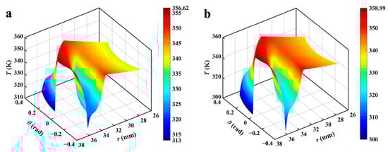 where Ts represents the seal ring’s temperature; T denotes the lubricating film’s local temperature; kls represents the convective heat transfer coefficients; cv refers to the lubricant’s specific heat; subscripts 1 and 2 denote the rotating and stationary ring, correspondingly; and qr and qθ are circumferential and radial flow rates, respectively [39].