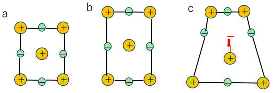 Barium titanate (BaTiO3) is one of the most important ferroelectric materials, and BaTiO3-based materials have been used in MLCCs, etc. [,,,,]. BaTiO3 has a perovskite structure as shown in Figure 5 []. The perovskite structure is seen for crystals with the chemical formula of ABX3 where A and B are two different cations, and X is an anion that bonds to both A and B []. X is often oxygen, and it is called perovskite oxides, denoted by ABO3 [,,]. Perovskite oxides have a cubic or nearly cubic crystal structure (Figure 5) []. For BaTiO3, A=Ba and B=Ti. At room temperature, the Ti atom (positive ion) is slightly displaced from the center of a cube, and accordingly there is electric polarization even without an applied electric field called spontaneous polarization, which is the origin of the ferroelectricity in BaTiO3 (Figure 6) []. The experimental lattice constants for BaTiO3 in Figure 6 are and . The atomic positions in units of along the X and Y axis and along the Z axis are as follows: Ba at (0,0,0), Ti at (0.5,0.5,0.514), O1 at (0.5,0.5,), and O2 at (0,0.5,0.488) and (0.5,0,0.488) (Figure 6) [,,,].