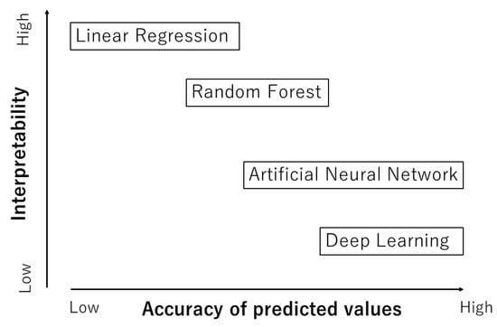 Then, the trained ANN model could predict the physical property under a given set of descriptors. The accuracy of the values predicted by an ANN model is relatively high for many cases (Figure 2) []. However, if the training experimental data contain considerable error, the trained ANN model becomes inaccurate, for which it is said garbage in, garbage out []. The interpretability of an ANN model is relatively low because an ANN model is very complex from the viewpoint of simple causality []. Thus, it is called a black-box model []. However, there have been some reports of improvements in the interpretability of an ANN model [,,,,,].