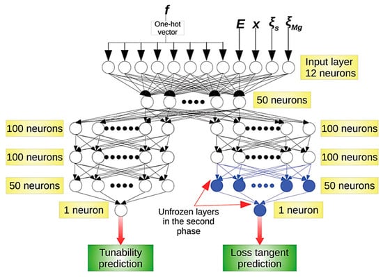 A deep neural network (deep learning) model with four hidden layers. In this example, a DL model was first trained with the results of theoretical calculations on tunability, which is the magnitude of the decrease in the dielectric constant divided by the initial dielectric constant, and the loss tangent which is the dielectric loss, under a given frequency (f), electric field (E), barium proportion (x) in MgO-doped BST (BaxSr1-xTiO3), the defect factor (), and that due to MgO (). Then, the DL model was trained with the experimental data only for the loss tangent for the unfrozen layers. Reprinted with permission from ref. []. Copyright 2020, The Royal Society of Chemistry.