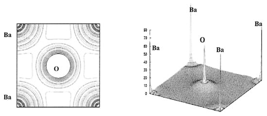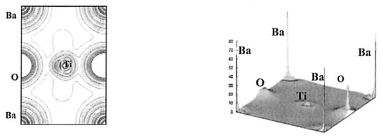 The results of the first principles calculations (DFT calculations) on the electron density in the (100) plane of BaTiO3 (left) and in three dimensions (right). Reprinted with permission from ref. []. Copyright 2003, Springer Nature.