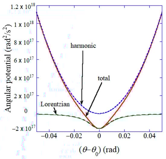 where the first term is the harmonic potential, and the second term is the nonlinear Lorentzian attractive potential. The assumed angular potential is shown in Figure 9 []. It should be noted that the parameters , , , and are fitting parameters []. The demerit of an ODE model is that there are occasionally free-fitting parameters. In other words, an ODE model needs to be validated by comparison with the experimental data or the results of first principles calculations [].