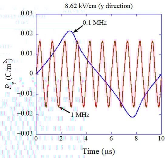 The result of the numerical simulation of the physical ODE model for flexoelectric polarization initially perpendicular to the applied alternating electric field (y-direction) on the component of polarization parallel to the applied electric field (y-direction) as a function of time. Reprinted with permission from ref. []. Copyright 2022, MDPI.