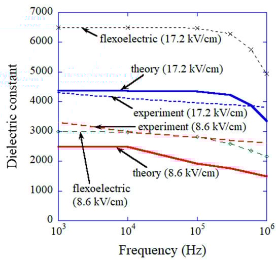 Comparison between the experimental data and the results of the numerical simulations of the physical ODE model on the dielectric constant (due to flexoelectric and ferroelectric contributions) as a function of frequency for the amplitudes of the applied alternating electric field of 17.24 kV cm−1 and 8.62 kV cm−1. The numerical results calculated solely by flexoelectric polarization are also shown. Reprinted with permission from ref. []. Copyright 2022, MDPI.