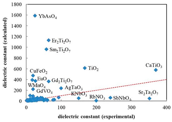 Comparison between the experimental data and the results of the first principles calculations (density functional perturbation theory) on the dielectric constant for 105 selected compounds. The red dashed line from the origin has a unit slope. Reprinted with permission from ref. []. Copyright 2019, IOP Publishing, Ltd., Bristol, UK.