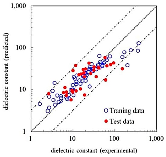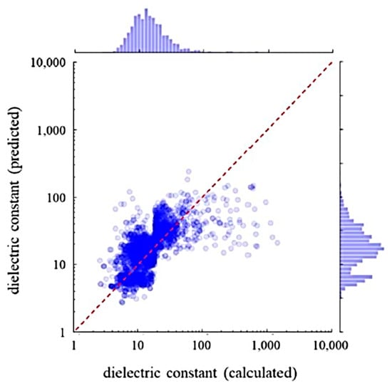 In Figure 13, the dielectric constants predicted by an RF model and the experimental data are compared []. An RF model was trained with the experimental data with 68 feature variables (descriptors) such as the dielectric constant by first principles calculations, ionization potentials, electron affinity, etc. []. The significantly important feature variable was the dielectric constant predicted by first principles calculation. Approximately 90% of the test data were within the 50% error range. In Figure 14, dielectric constants predicted by an RF model for 2504 compounds are compared with those predicted by first principles calculations []. There is some systematic error in dielectric constants predicted by first principles calculations originating in some elemental features. In conclusion, many dielectric constants predicted by first principles calculations deviate significantly from experimental data (Figure 12). The accurate prediction of dielectric constants by ML is possible by correcting the results of first principles calculations by using some elemental feature variables (Figure 13) []. In summary, ML could correct the results of first principles calculations to fit the experimental data.